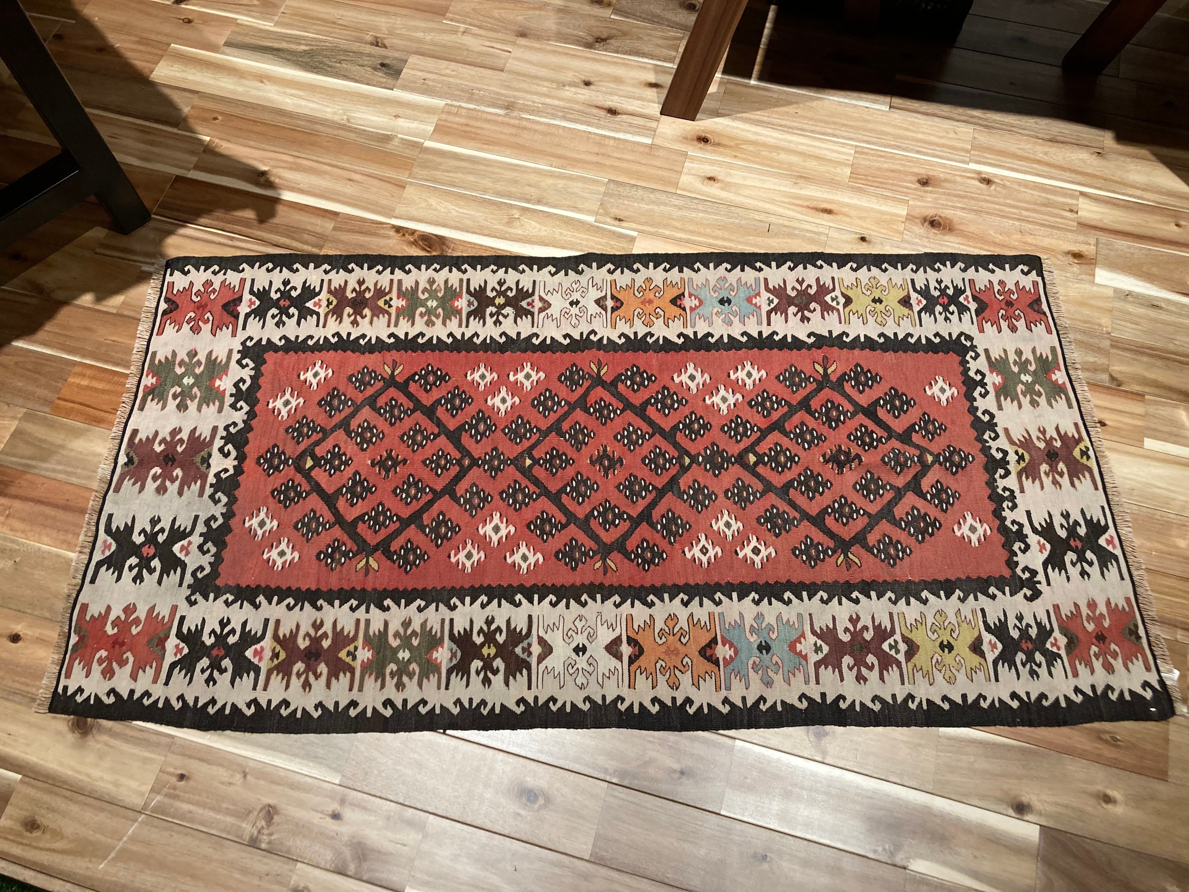 ビンテージキリムなので、色合いがかすれている部分もありますが、とても味が出ていてお部屋をオシャレに演出するアイテムとして、大変オススメです!!